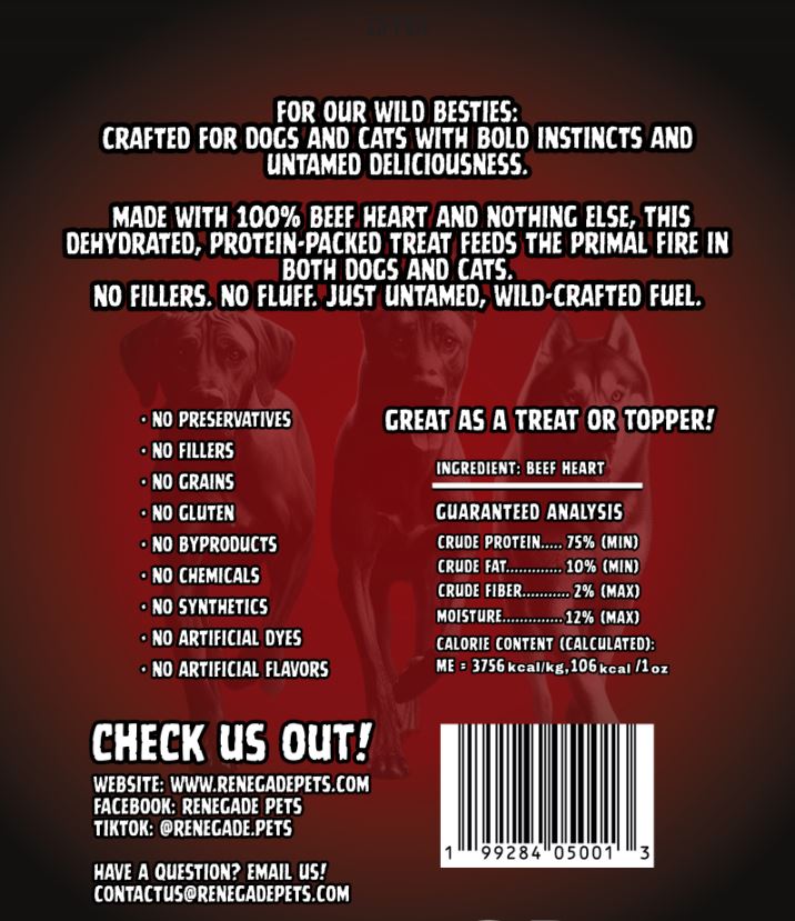 Treat your pets to the wholesome, high-quality goodness they crave. RENEGADE Fierce - Dehydrated Beef Heart is the natural choice for happy, healthy companions!